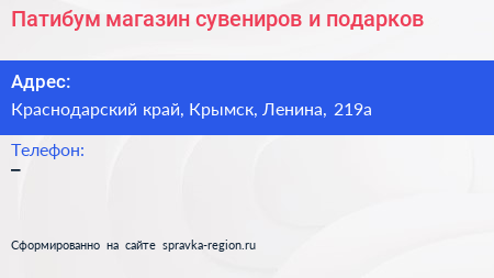 Патибум, магазин сувениров и подарков по адресу Краснодарский край, Крымск, Ленина, 219а в дальнейшем Организация, размещена в следующих категориях:
