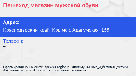 Пешеход, магазин мужской обуви по адресу Краснодарский край, Крымск, Адагумская, 155 в дальнейшем Организация, размещена в следующих категориях: