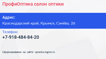 ПрофиОптика, салон оптики по адресу Краснодарский край, Крымск, Синёва, 26 в дальнейшем Организация, размещена в следующих категориях: