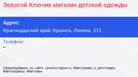 Золотой Ключик, магазин детской одежды по адресу Краснодарский край, Крымск, Ленина, 211 в дальнейшем Организация, размещена в следующих категориях: