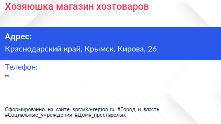 Хозяюшка, магазин хозтоваров по адресу Краснодарский край, Крымск, Кирова, 26 в дальнейшем Организация, размещена в следующих категориях:
