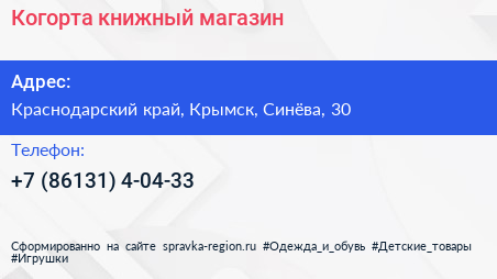 Когорта, книжный магазин по адресу Краснодарский край, Крымск, Синёва, 30 в дальнейшем Организация, размещена в следующих категориях: