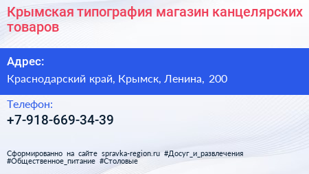 Крымская типография, магазин канцелярских товаров по адресу Краснодарский край, Крымск, Ленина, 200 в дальнейшем Организация, размещена в следующих категориях: