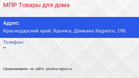 МПР Товары для дома по адресу Краснодарский край, Крымск, Демьяна Бедного, 19Б в дальнейшем Организация, размещена в следующих категориях:
