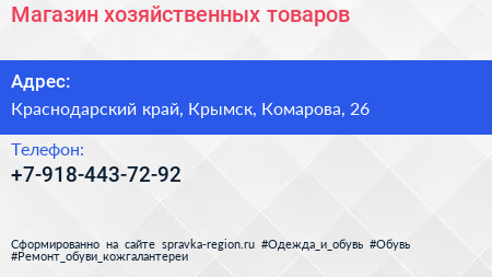 Магазин хозяйственных товаров по адресу Краснодарский край, Крымск, Комарова, 26 в дальнейшем Организация, размещена в следующих категориях: