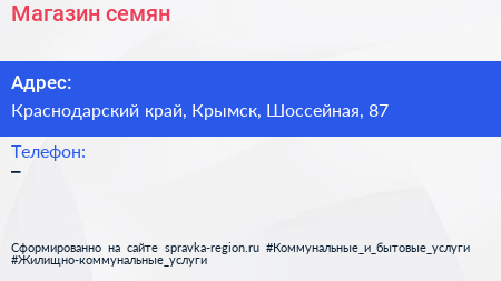 Магазин семян по адресу Краснодарский край, Крымск, Шоссейная, 87 в дальнейшем Организация, размещена в следующих категориях: