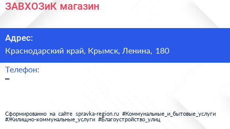 ЗАВХОЗиК, магазин по адресу Краснодарский край, Крымск, Ленина, 180 в дальнейшем Организация, размещена в следующих категориях: