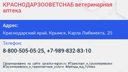 КРАСНОДАРЗООВЕТСНАБ, ветеринарная аптека по адресу Краснодарский край, Крымск, Карла Либкнехта, 25 в дальнейшем Организация, размещена в следующих категориях: