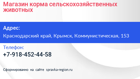 Магазин корма сельскохозяйственных животных по адресу Краснодарский край, Крымск, Коммунистическая, 153 в дальнейшем Организация, размещена в следующих категориях: