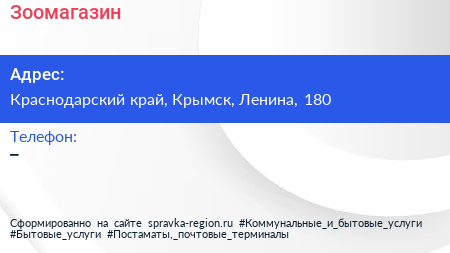 Зоомагазин по адресу Краснодарский край, Крымск, Ленина, 180 в дальнейшем Организация, размещена в следующих категориях: