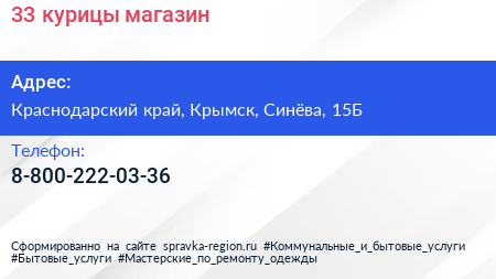 33 курицы, магазин по адресу Краснодарский край, Крымск, Синёва, 15Б в дальнейшем Организация, размещена в следующих категориях: