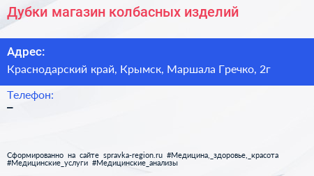 Дубки, магазин колбасных изделий по адресу Краснодарский край, Крымск, Маршала Гречко, 2г в дальнейшем Организация, размещена в следующих категориях: