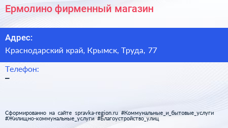 Ермолино, фирменный магазин по адресу Краснодарский край, Крымск, Труда, 77 в дальнейшем Организация, размещена в следующих категориях: