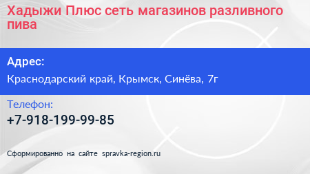 Хадыжи Плюс, сеть магазинов разливного пива по адресу Краснодарский край, Крымск, Синёва, 7г в дальнейшем Организация, размещена в следующих категориях:
