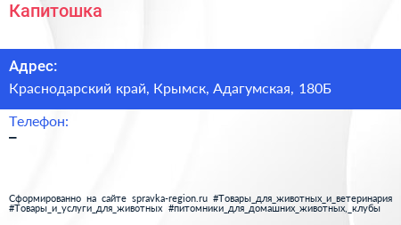 Капитошка по адресу Краснодарский край, Крымск, Адагумская, 180Б в дальнейшем Организация, размещена в следующих категориях: