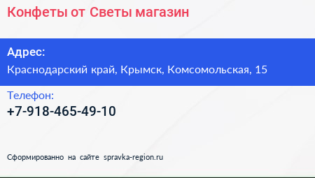 Конфеты от Светы, магазин по адресу Краснодарский край, Крымск, Комсомольская, 15 в дальнейшем Организация, размещена в следующих категориях: