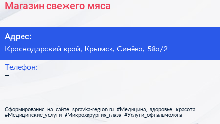 Магазин свежего мяса по адресу Краснодарский край, Крымск, Синёва, 58а/2 в дальнейшем Организация, размещена в следующих категориях: