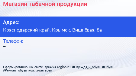 Магазин табачной продукции по адресу Краснодарский край, Крымск, Вишнёвая, 8а в дальнейшем Организация, размещена в следующих категориях: