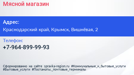 Мясной магазин по адресу Краснодарский край, Крымск, Вишнёвая, 2 в дальнейшем Организация, размещена в следующих категориях: