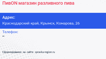 ПивON, магазин разливного пива по адресу Краснодарский край, Крымск, Комарова, 26 в дальнейшем Организация, размещена в следующих категориях: