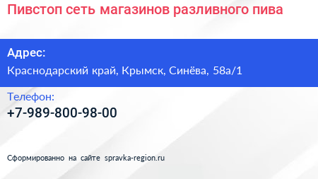 Пивстоп, сеть магазинов разливного пива по адресу Краснодарский край, Крымск, Синёва, 58а/1 в дальнейшем Организация, размещена в следующих категориях: