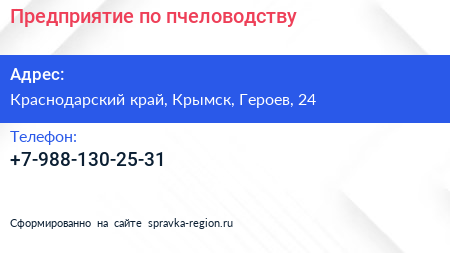 Предприятие по пчеловодству по адресу Краснодарский край, Крымск, Героев, 24 в дальнейшем Организация, размещена в следующих категориях: