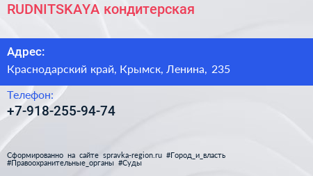 RUDNITSKAYA, кондитерская по адресу Краснодарский край, Крымск, Ленина, 235 в дальнейшем Организация, размещена в следующих категориях: