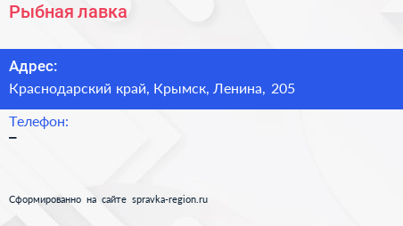 Рыбная лавка по адресу Краснодарский край, Крымск, Ленина, 205 в дальнейшем Организация, размещена в следующих категориях: