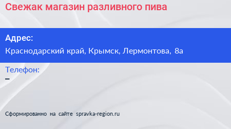Свежак, магазин разливного пива по адресу Краснодарский край, Крымск, Лермонтова, 8а в дальнейшем Организация, размещена в следующих категориях: