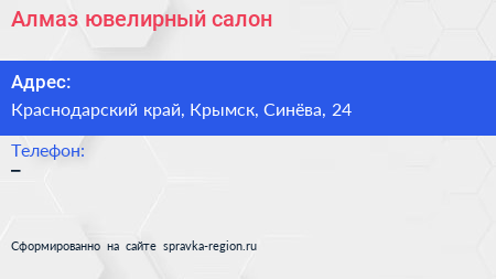 Алмаз, ювелирный салон по адресу Краснодарский край, Крымск, Синёва, 24 в дальнейшем Организация, размещена в следующих категориях: