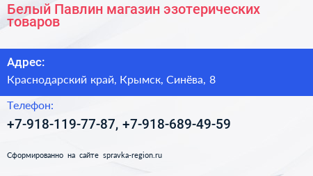 Белый Павлин, магазин эзотерических товаров по адресу Краснодарский край, Крымск, Синёва, 8 в дальнейшем Организация, размещена в следующих категориях: