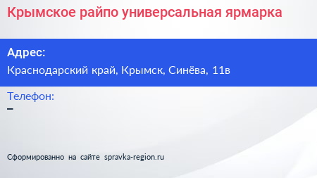 Крымское райпо, универсальная ярмарка по адресу Краснодарский край, Крымск, Синёва, 11в в дальнейшем Организация, размещена в следующих категориях: