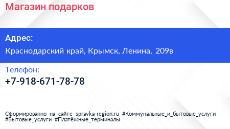 Магазин подарков по адресу Краснодарский край, Крымск, Ленина, 209в в дальнейшем Организация, размещена в следующих категориях: