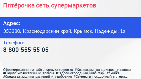 Пятёрочка, сеть супермаркетов по адресу 353380, Краснодарский край, Крымск, Надежды, 1а в дальнейшем Организация, размещена в следующих категориях: