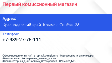 Первый комиссионный магазин по адресу Краснодарский край, Крымск, Синёва, 26 в дальнейшем Организация, размещена в следующих категориях: