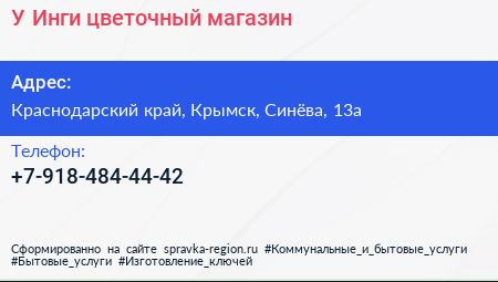 У Инги, цветочный магазин по адресу Краснодарский край, Крымск, Синёва, 13а в дальнейшем Организация, размещена в следующих категориях: