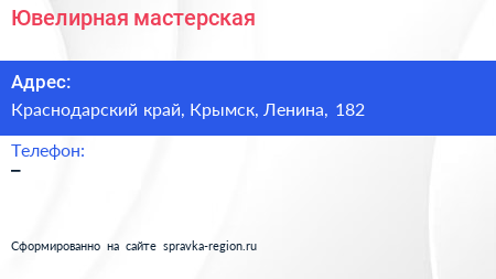 Ювелирная мастерская по адресу Краснодарский край, Крымск, Ленина, 182 в дальнейшем Организация, размещена в следующих категориях: