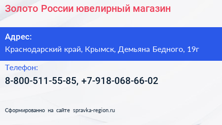 Золото России, ювелирный магазин по адресу Краснодарский край, Крымск, Демьяна Бедного, 19г в дальнейшем Организация, размещена в следующих категориях:
