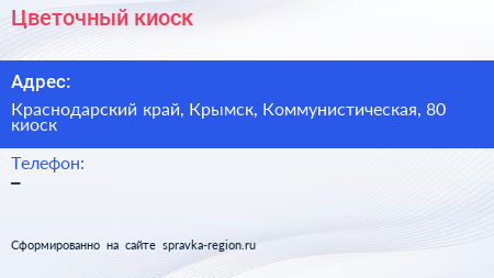 Цветочный киоск по адресу Краснодарский край, Крымск, Коммунистическая, 80 киоск в дальнейшем Организация, размещена в следующих категориях: