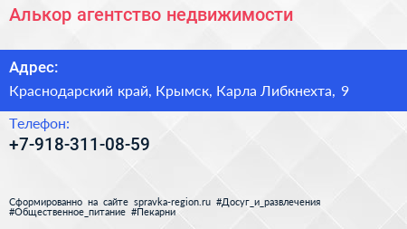 Алькор, агентство недвижимости по адресу Краснодарский край, Крымск, Карла Либкнехта, 9 в дальнейшем Организация, размещена в следующих категориях: