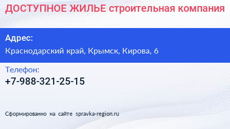 ДОСТУПНОЕ ЖИЛЬЕ, строительная компания по адресу Краснодарский край, Крымск, Кирова, 6 в дальнейшем Организация, размещена в следующих категориях: