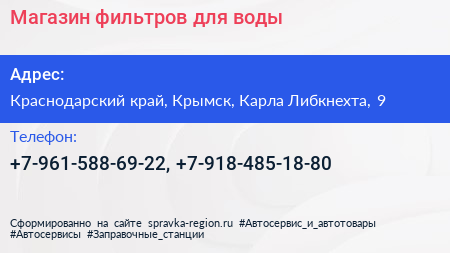 Магазин фильтров для воды по адресу Краснодарский край, Крымск, Карла Либкнехта, 9 в дальнейшем Организация, размещена в следующих категориях: