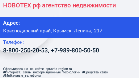 НОВОТЕХ.рф, агентство недвижимости по адресу Краснодарский край, Крымск, Ленина, 217 в дальнейшем Организация, размещена в следующих категориях: