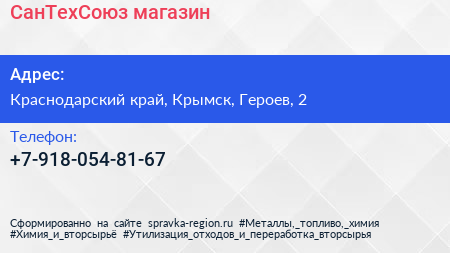 СанТехСоюз, магазин по адресу Краснодарский край, Крымск, Героев, 2 в дальнейшем Организация, размещена в следующих категориях:
