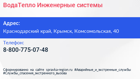 ВодаТепло-Инженерные системы по адресу Краснодарский край, Крымск, Комсомольская, 40 в дальнейшем Организация, размещена в следующих категориях:
