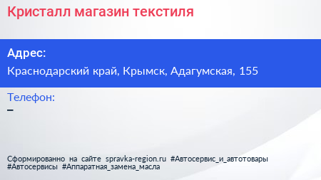 Кристалл, магазин текстиля по адресу Краснодарский край, Крымск, Адагумская, 155 в дальнейшем Организация, размещена в следующих категориях: