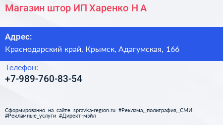 Магазин штор, ИП Харенко Н.А. по адресу Краснодарский край, Крымск, Адагумская, 166 в дальнейшем Организация, размещена в следующих категориях: