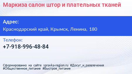 Маркиза, салон штор и плательных тканей по адресу Краснодарский край, Крымск, Ленина, 180 в дальнейшем Организация, размещена в следующих категориях: