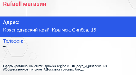 Rafaell, магазин по адресу Краснодарский край, Крымск, Синёва, 15 в дальнейшем Организация, размещена в следующих категориях: