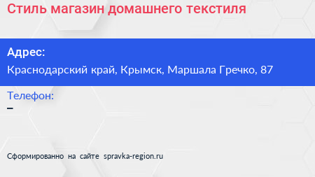 Стиль, магазин домашнего текстиля по адресу Краснодарский край, Крымск, Маршала Гречко, 87 в дальнейшем Организация, размещена в следующих категориях: